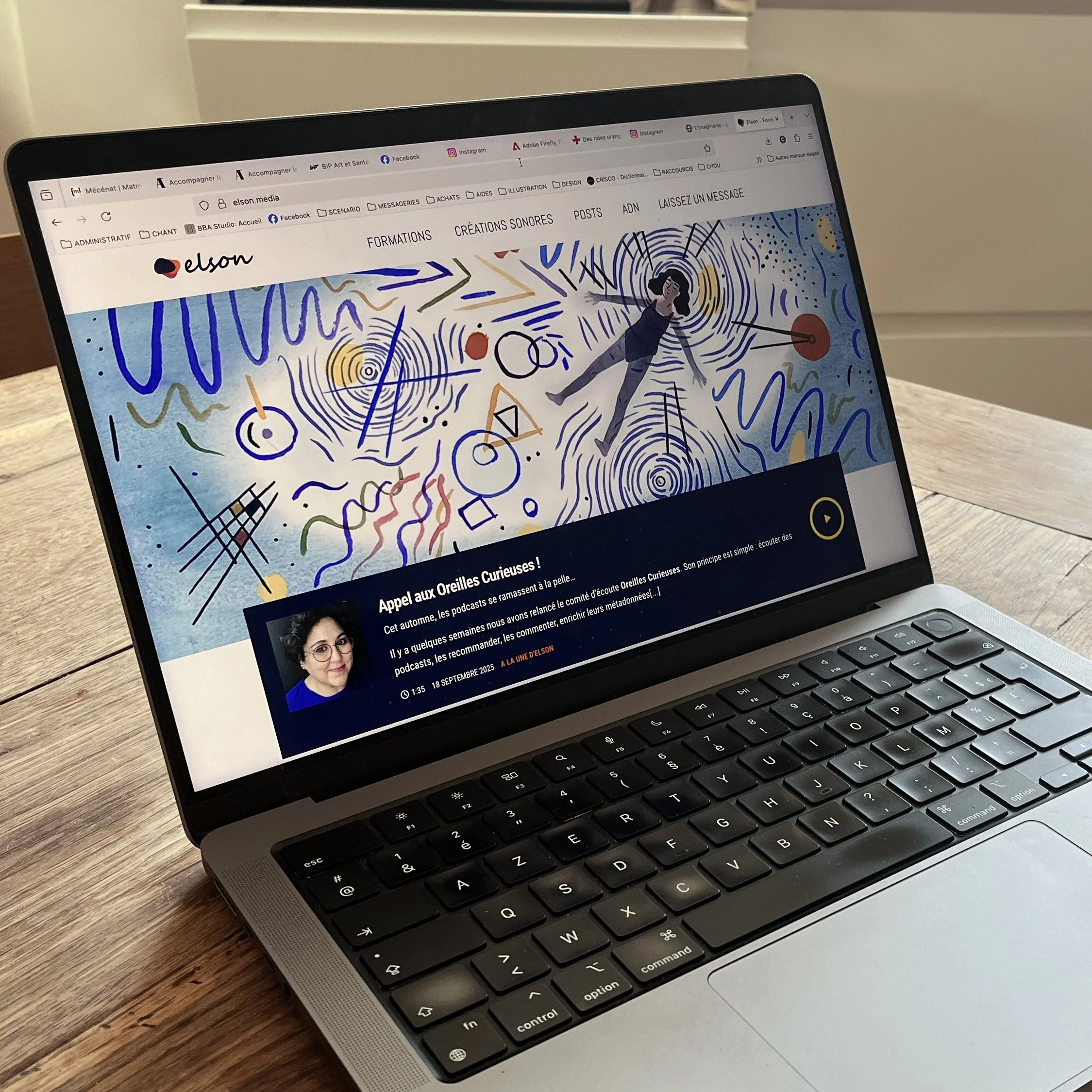 Création du visuel de la marque Elson. Créée en 2015, sous l’impulsion de Carine Fillot, ancienne collaboratrice à Radio France, autrice, productrice et formatrice, Elson explore toutes les dimensions du podcast : la formation, la création et la découvrabilité.