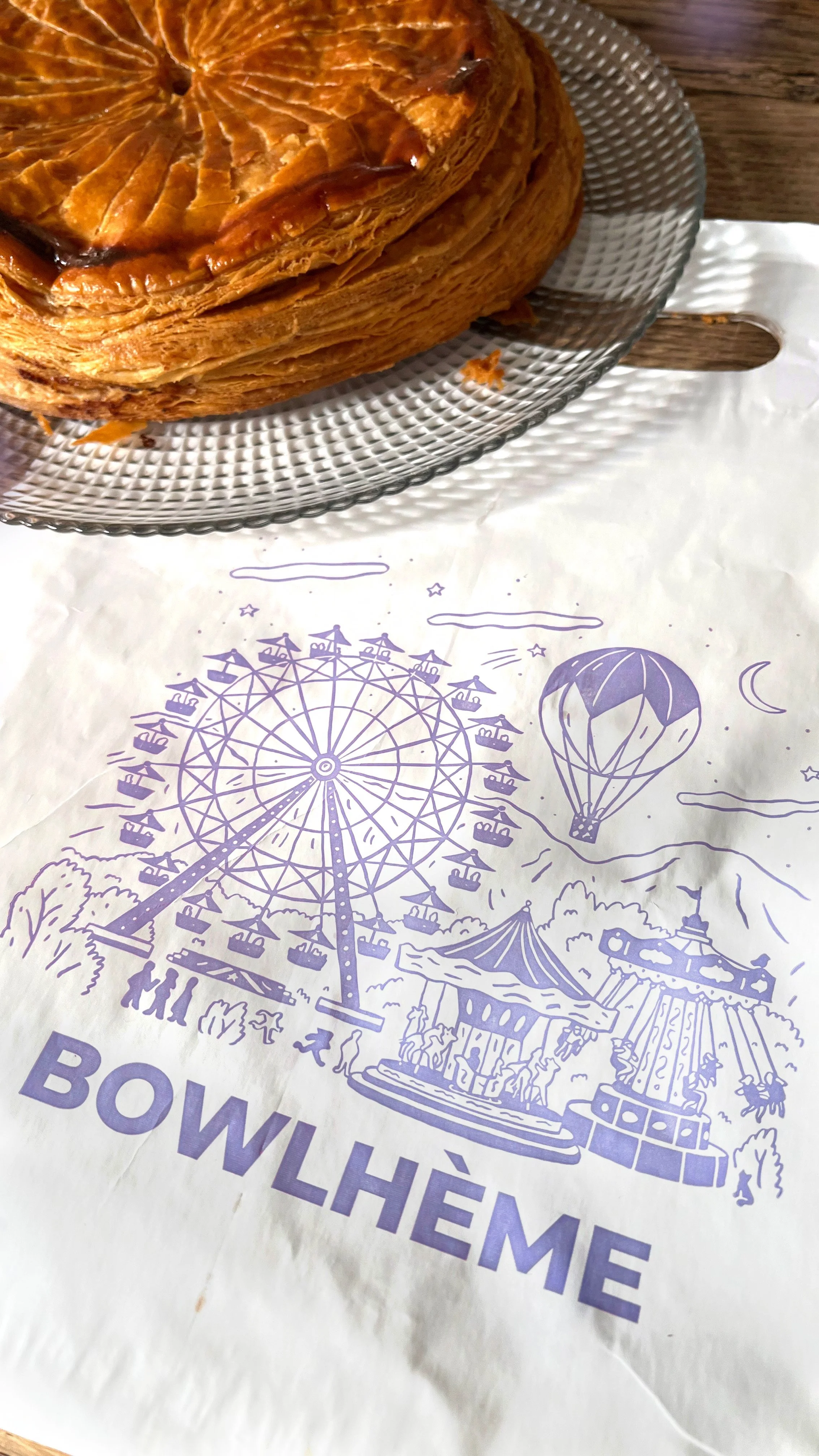 En 2026, la pâtisserie Bowlhème se met aux couleurs de la fête foraine et me commande une image sur ce thème. Je créée une illustration avec une seule couleur, en vectoriel, pour les sacs à galette.